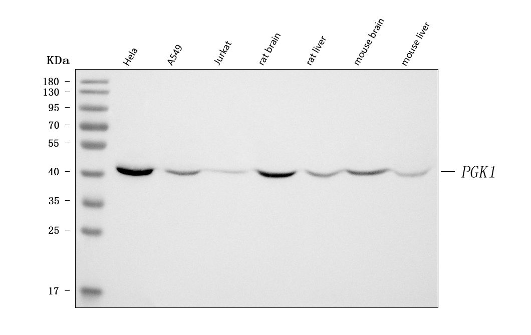 Western blot analysis of PGK1 using anti-PGK1 antibody (PB0824). The sample well of each lane was loaded with 30 ug of sample under reducing conditions.